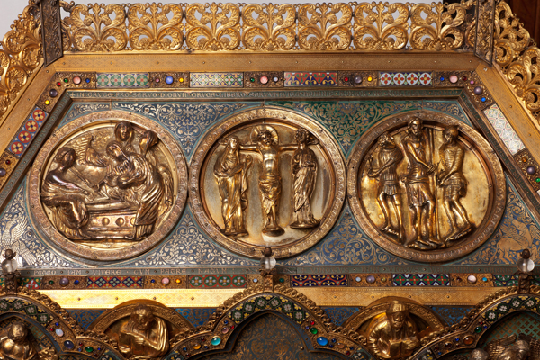 長さ220cm/幅110cm高さ153cmで 中世最大の彫金細工であり 聖遺物箱となっています。